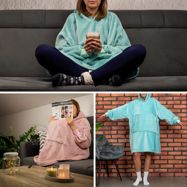 Měkká a teplá oversized mikina s kapucí ve stylu deky. Snadno se změní v polštář. Mikinová deka se dá použít jako župan. Ideální pro všechna roční období (zejména pro podzim a zimu). Výrobek na doma i do exteriéru.