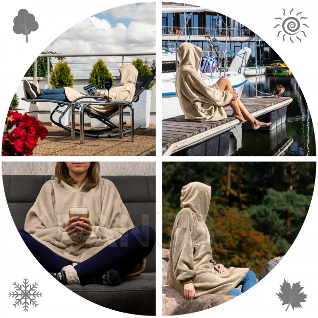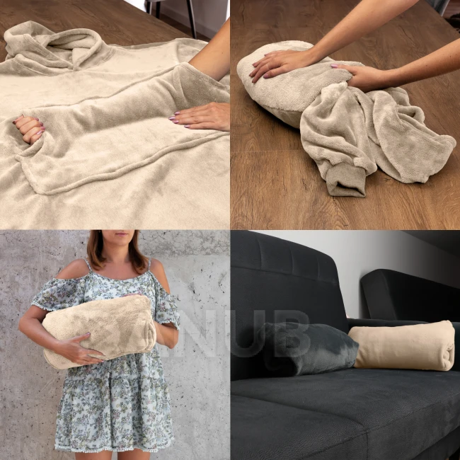 Snadno se změní v polštář. Mikinová deka se dá použít jako župan. Ideální pro všechna roční období (zejména pro podzim a zimu). Výrobek na doma i do exteriéru.