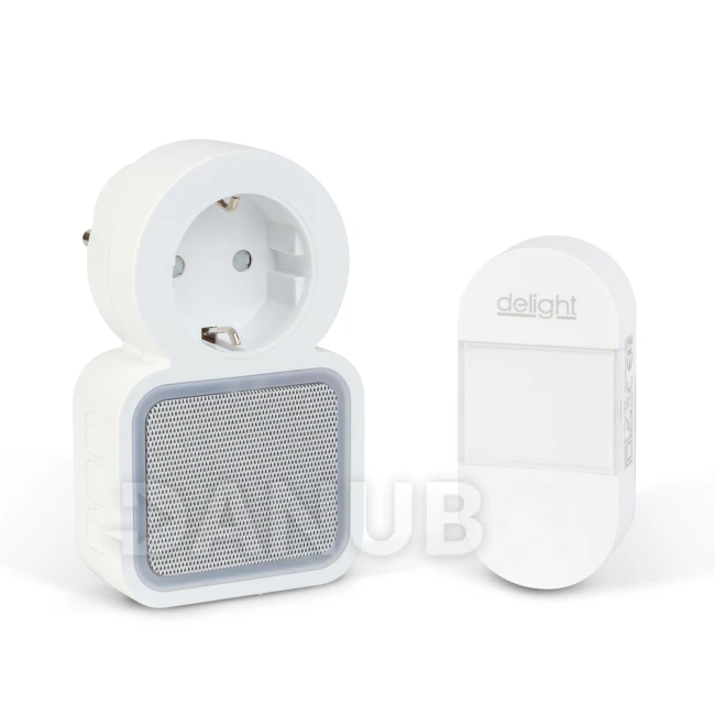 Digitální bezbateriový a bezdrátový zvonek – Kinetický – do zásuvky 220–240V AC – bílý – modrá LED