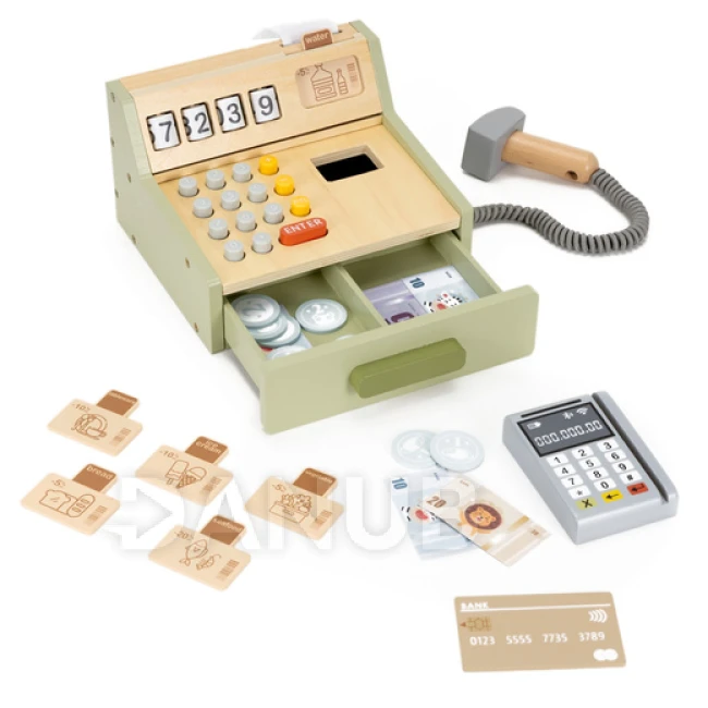 Pokladna má klikací tlačítka a rotující role, které umožňují dítěti „zaznamenávat nákupy“. Dřevěná čtečka karet vypadá realisticky s ozdobnými malovanými tlačítky, ale nefunguje jako skutečná čtečka.
