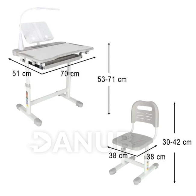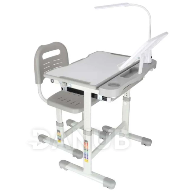Dětský polohovatelný psací stůl se židlí - LED lampa, USB - šedý