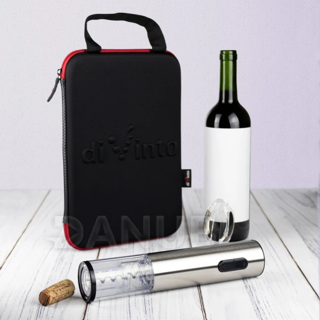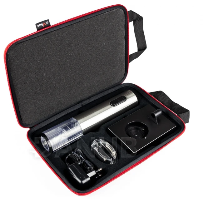Obsah soupravy: vývrtka na víno, pouzdro, stojan, řezačka fólie, nabíječka.