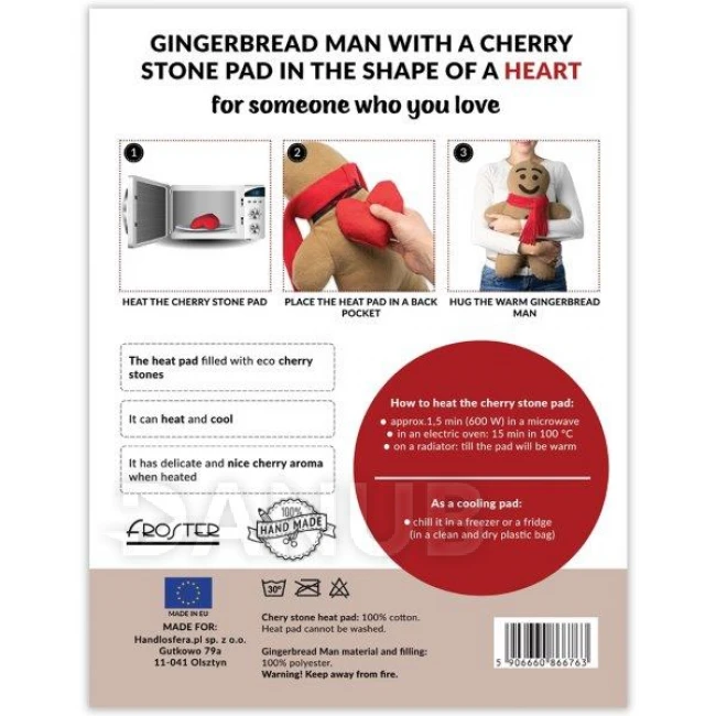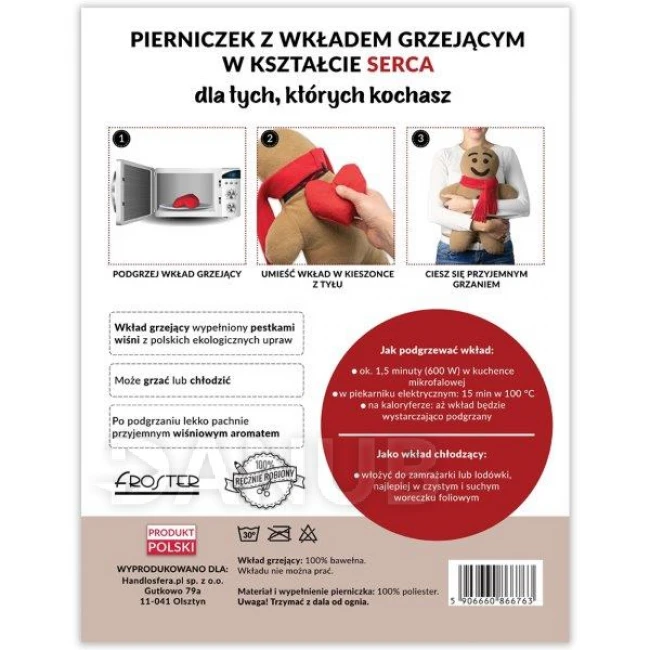 Plyšová hračka s kapsou na srdíčko, které hřeje nebo chladí - podle vašich potřeb (tzv. Dry hot-water bottle). Srdíčko je naplněné eko cherry kamínky. Po zahřátí má srdíčko příjemnou vůni třešní. Kapsa na polštářek se zapínáním na zip.