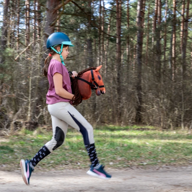 Velký hobby kůň A3 s ohlávkou a oklidy v sadě.