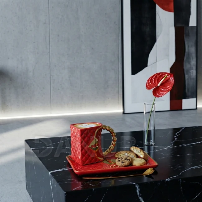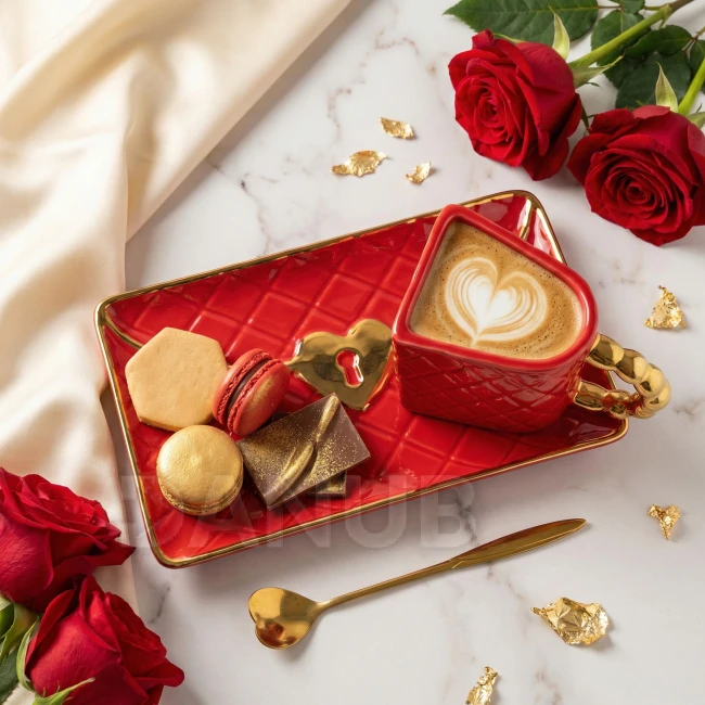 Červený hrnek ve tvaru kabelky s podšálkem ve tvaru psaníčka a zlatou lžičkou ve tvaru srdce.