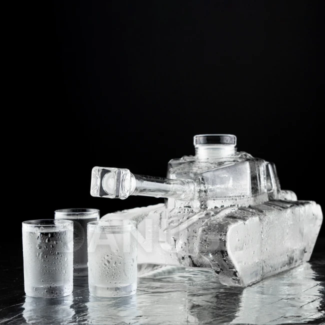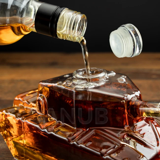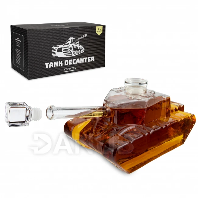 Skleněná karafa ve tvaru tanku.