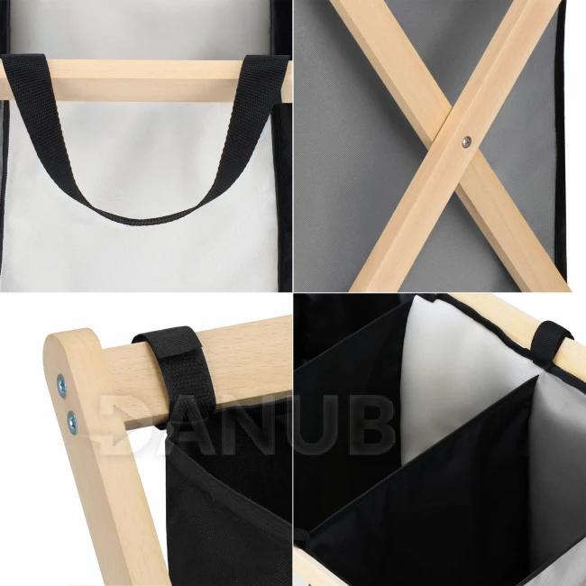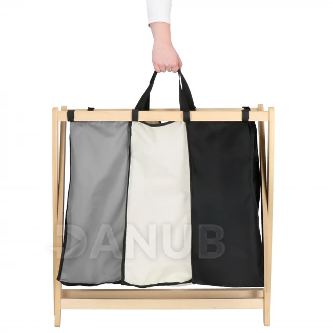 - Volně stojící, otevřený prádelní koš; dřevěný rám + látkové přihrádky