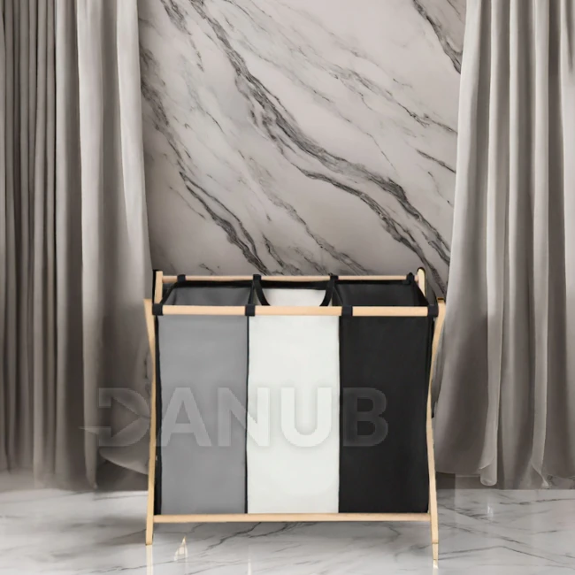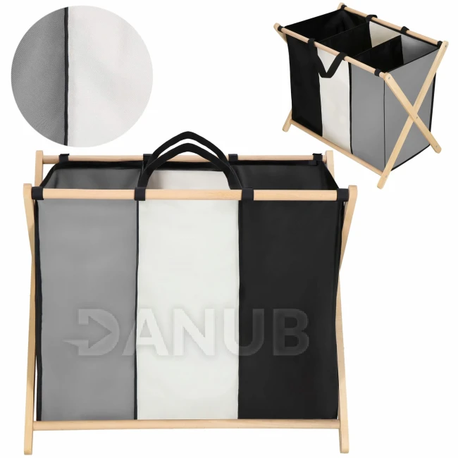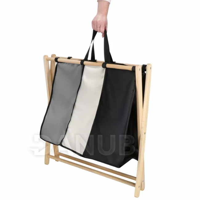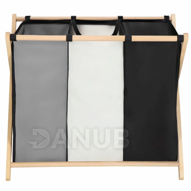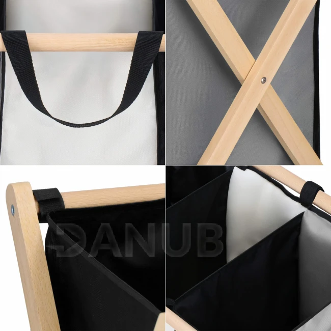 - Volně stojící, otevřený prádelní koš; dřevěný rám + látkové přihrádky