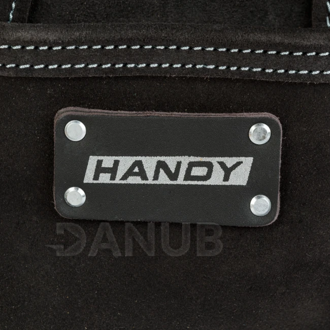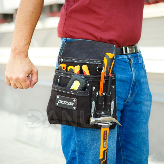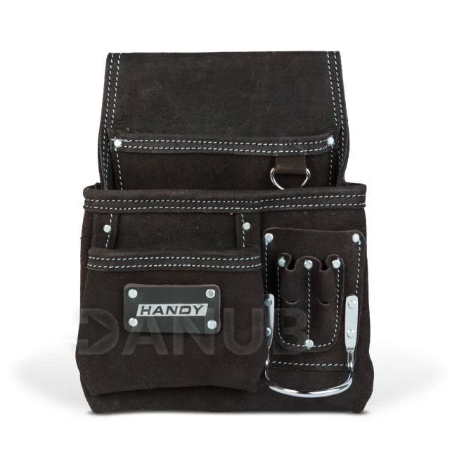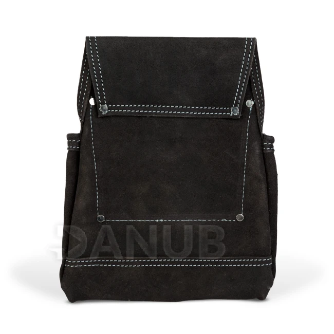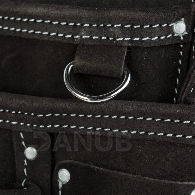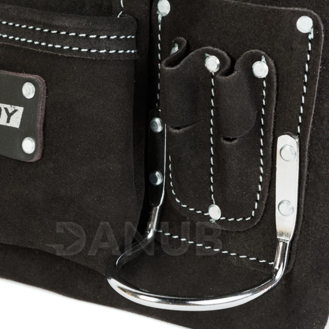 Hašené kožené pouzdro na opasek se 2 velkými kapsami, 2 závěsnými smyčkami, páskem a 4 menšími přihrádkami (např. na tužky). Odolné provedení, zpevněné kovovými nýty.