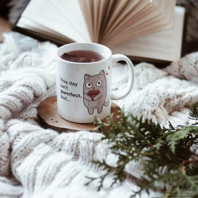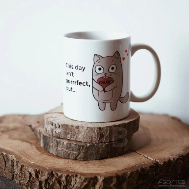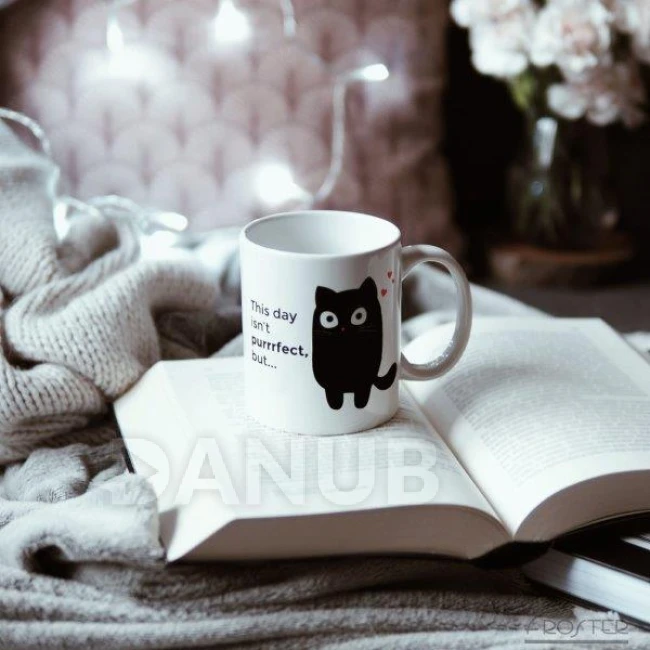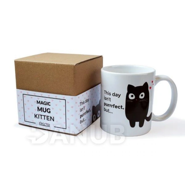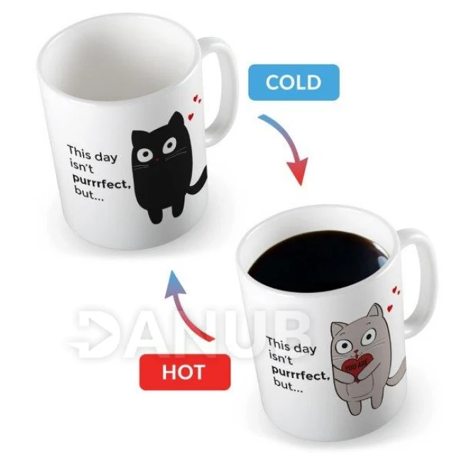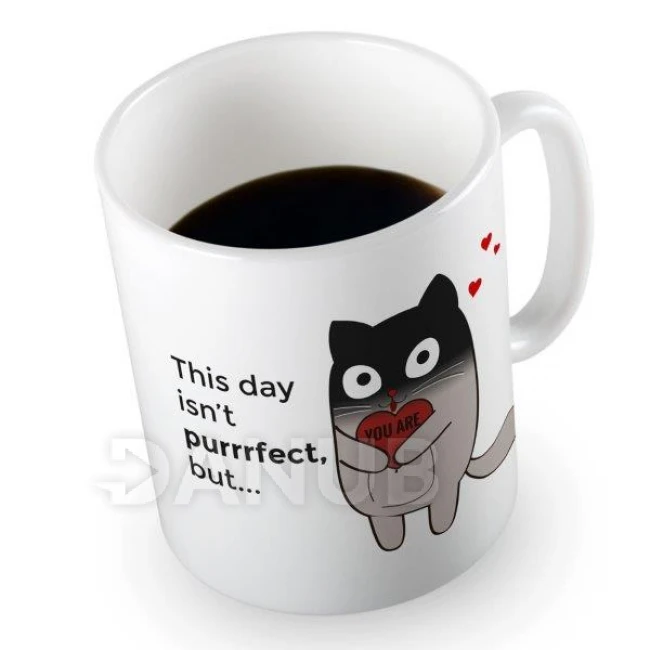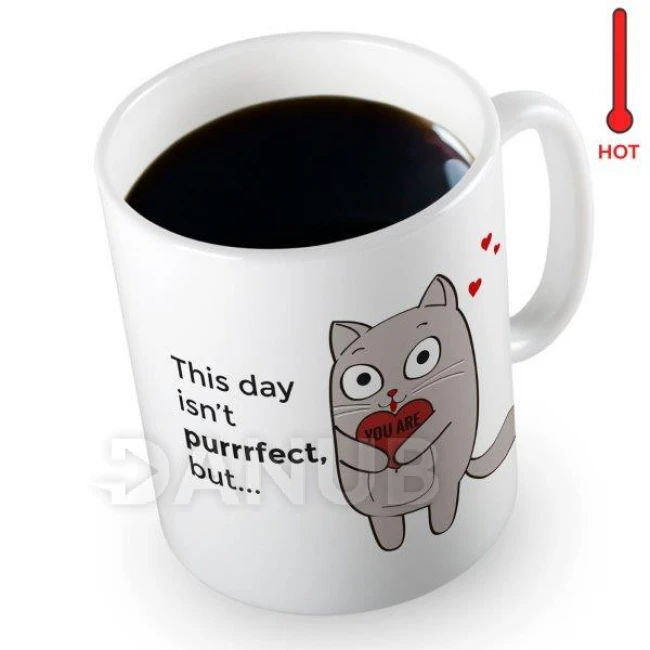 Hrnek s měnící se kočkou a ukrytou zprávou: This day is not Purrfect, but ... YOU ARE.