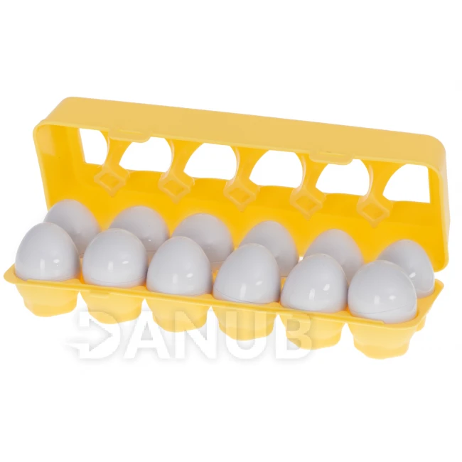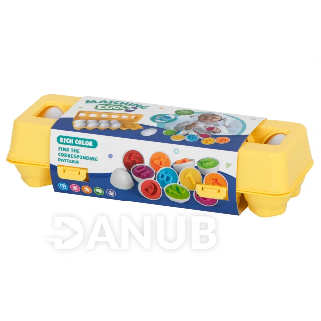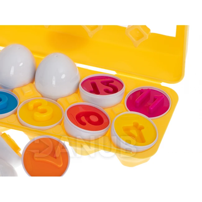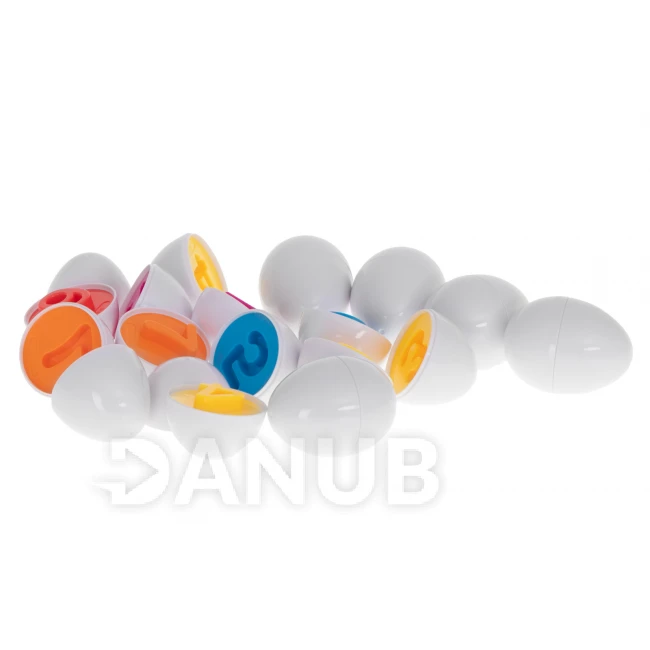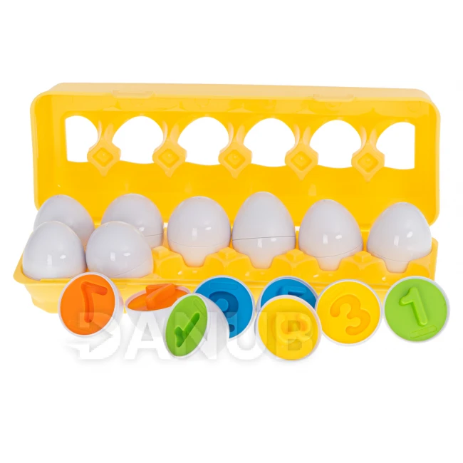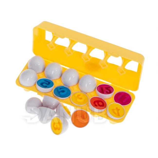 Vzdělávací hra obsahuje 12 vajíček, která pod skořápkou skrývají různá čísla a barvy. Úkolem dítěte je najít stejné číslo a spojit vajíčka podle barvy.