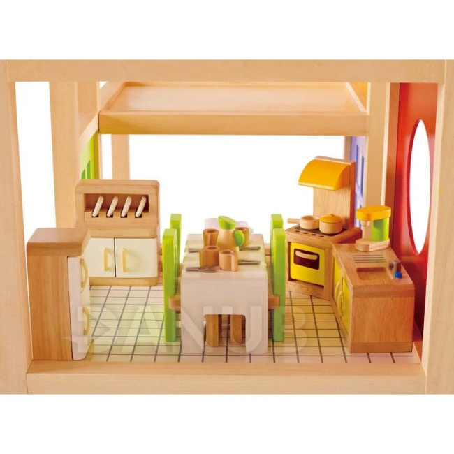Dřevěný nábytek a doplňky do kuchyňky v domečku pro panenky obsahuje chladničku s mrazákem, sporák s digestoří, skříňku s dřezem, kávovar, hrnce.