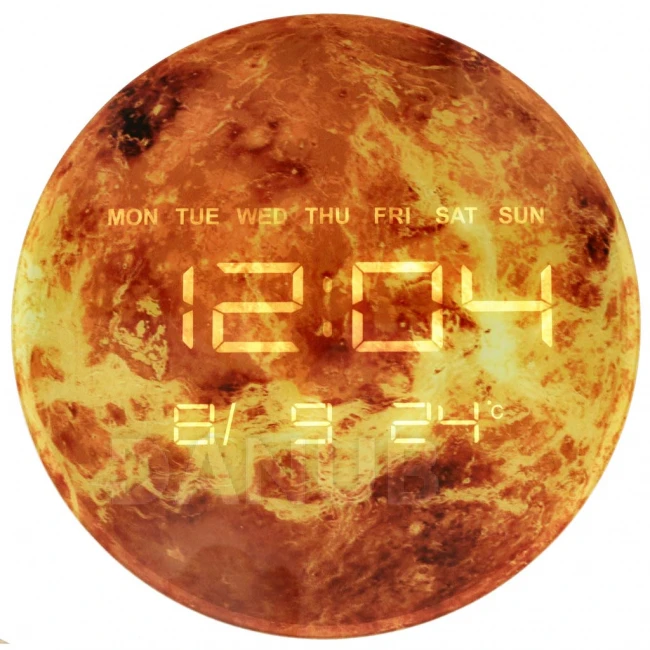 Funkčnost a styl jsou hlavní rysy těchto hodin s grafikou planety Mars! Intuitivní displej zobrazuje přesný čas (12/24h), datum (M/D/Y), den v týdnu (v angličtině) a aktuální teplotu. Po nastavení data a času bude den v týdnu nepřetržitě blikat. Díky možnosti pověsit jej na zeď nebo umístit na přiložený stojan se hodí do každého interiéru. Napájení z elektrické sítě, s přídavnou baterií CR2032 (součást balení) pro ochranu nastavení, zaručuje spolehlivý provoz.