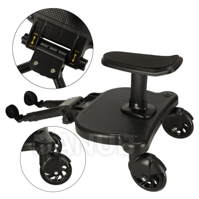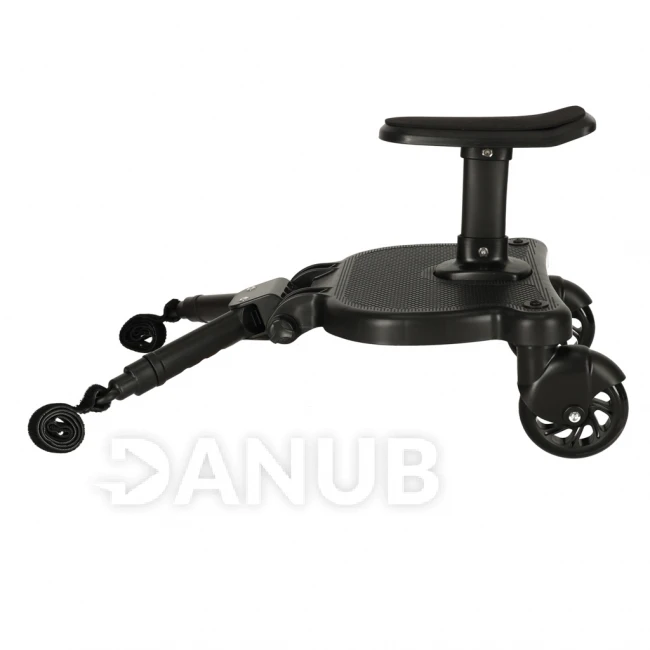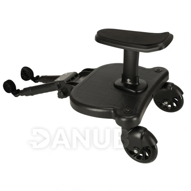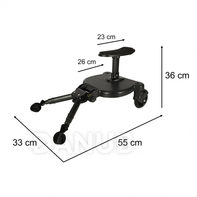 Prodloužení kočárku se sedačkou je praktická nabídka pro rodiče, kteří potřebují místo pro svého „staršího“ při procházce s batoletem v kočárku. Univerzální montážní systém umožňuje připevnit nástavec na kočárky od různých výrobců. Maximální zatížení je 25 kilogramů. Souprava obsahuje montážní popruh, který vám umožní zavěsit stojan na kočárek, když se chvíli nepoužívá.