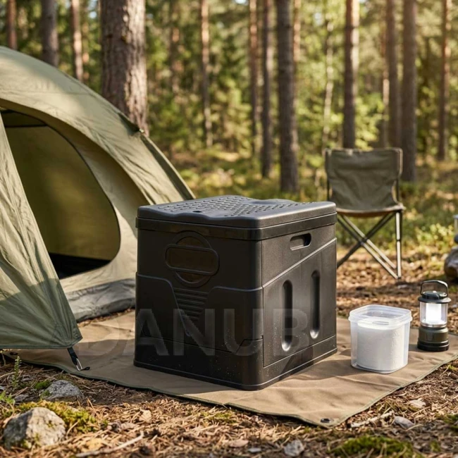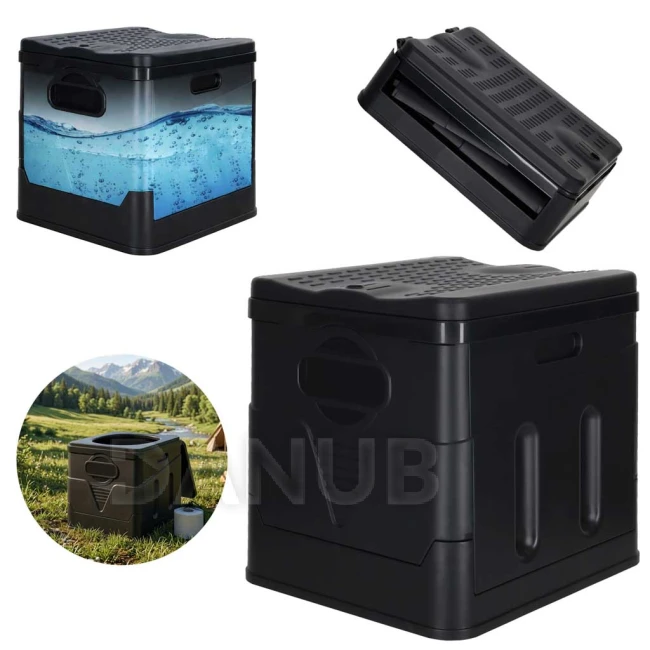 Kompaktní přenosná toaleta o objemu 20l, ideální pro kempování, výlety a outdoor aktivity.