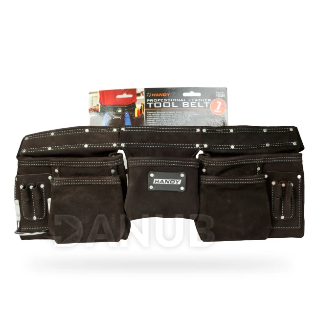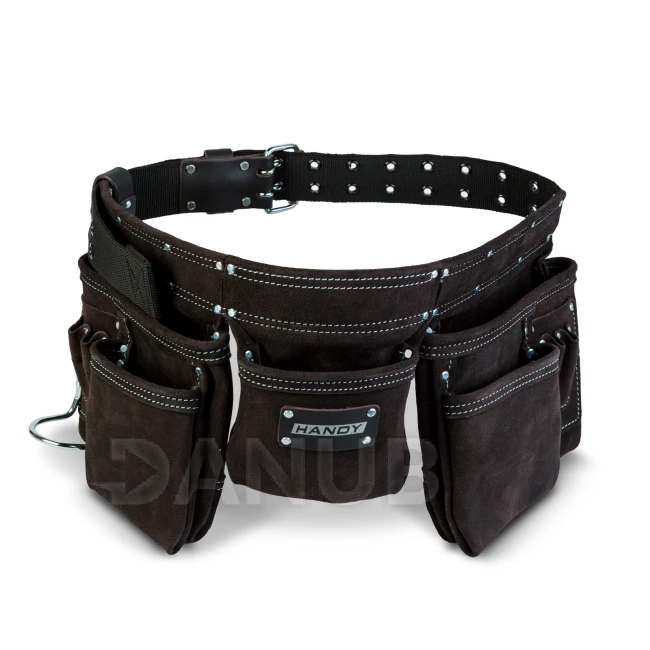 Extra kvalitní pracovní pásek Handy z pravého hovězího kůže, který je vynikajícím společníkem pro každého řemeslníka: truhláře, instalatéra, elektrikáře či domácí kutily. Masivní švy a pevné nýty zaručují dlouhou životnost a dobře rozložené kapsy a držáky udrží všechny potřebné nástroje po ruce.