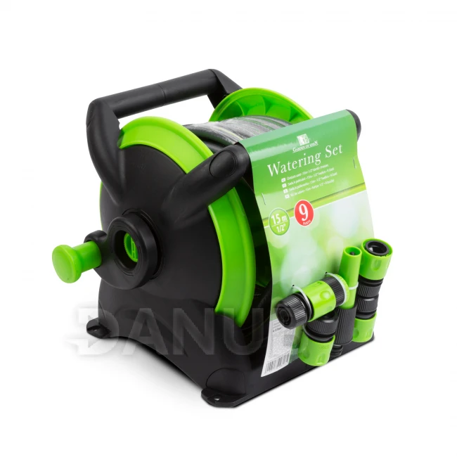 Tato zahradní polévací sada dokonale vyhovuje potřebám většiny domácností. Obsahem sady je kromě 15 metrů dlouhé hadice a úložného bubnu i postřikovací tryska, spojka na hadici a kohoutek (rychlospojky), které zajišťují pohodlné používání. Bubon se díky kompaktním rozměrům snadno přenáší stávajícím hadicím.