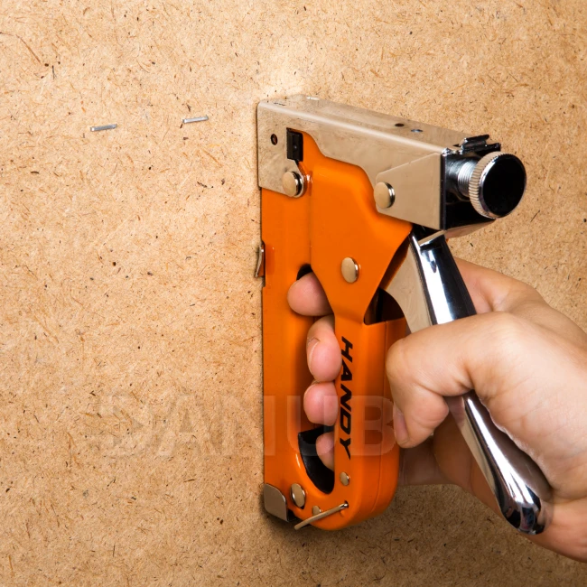 Odolná kovová ruční sešívačka, která je vhodná i pro sešívání potahů, látek, dřeva, papíru a fólie. Sešívačku lze použít i pro vkládání čtvercových, ohnutých sponek a hřebíků "T" mezi 4 a 14 mm. Seřizovací šroub v horní části sešívačky lze použít k nastavení síly vkládání v závislosti na materiálu, který se má sešívat. Může být ideální pro pracovní i domácí použití.