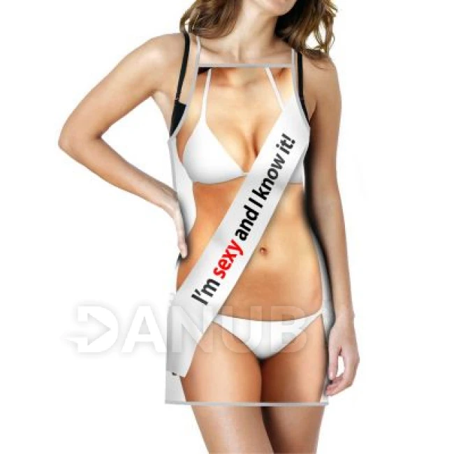 Kuchyňská zástěra s potiskem ženského těla a nápisem I Jsem sexy and I know it!