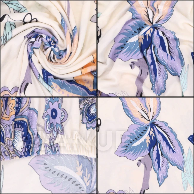 - Barva: ecru, odstíny fialové, modré, oranžové, krémové, šedé