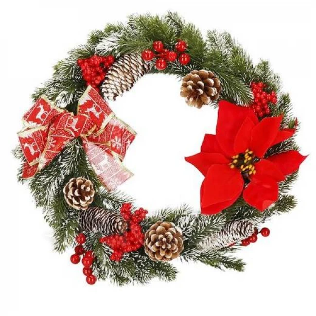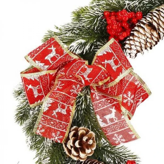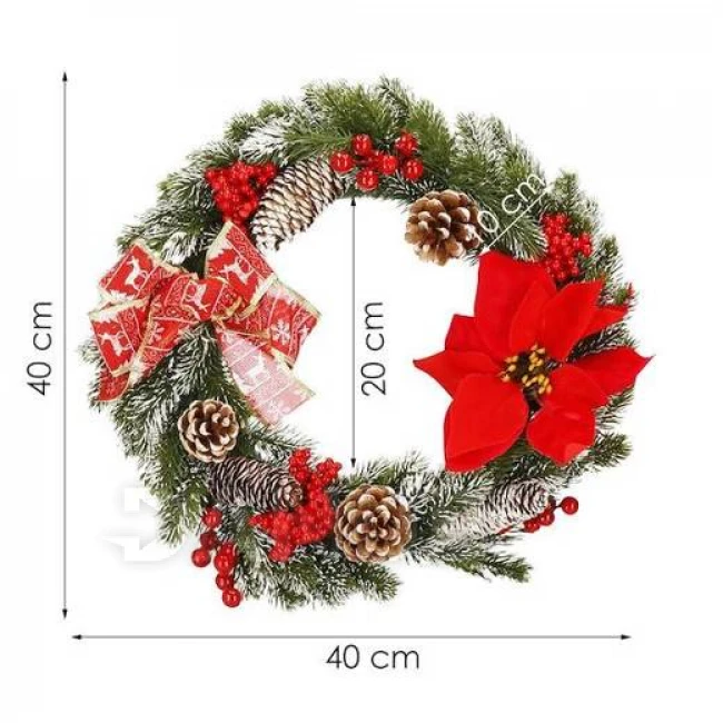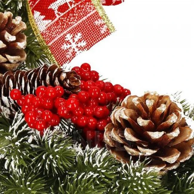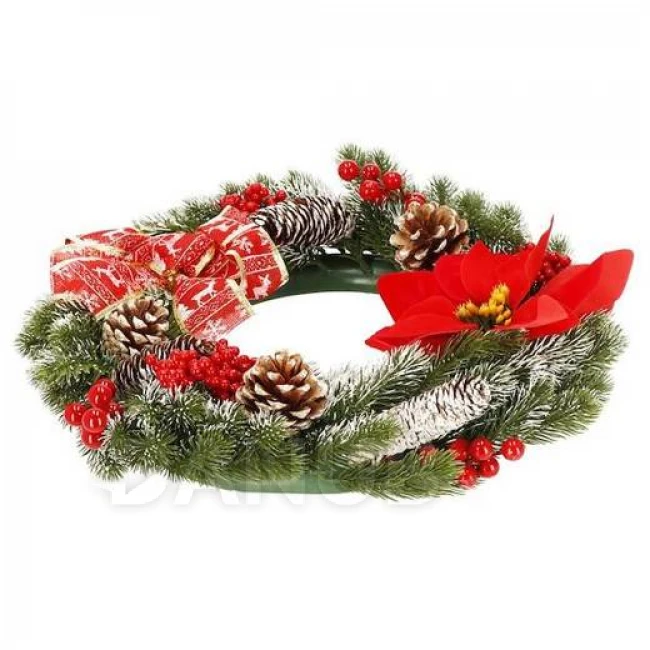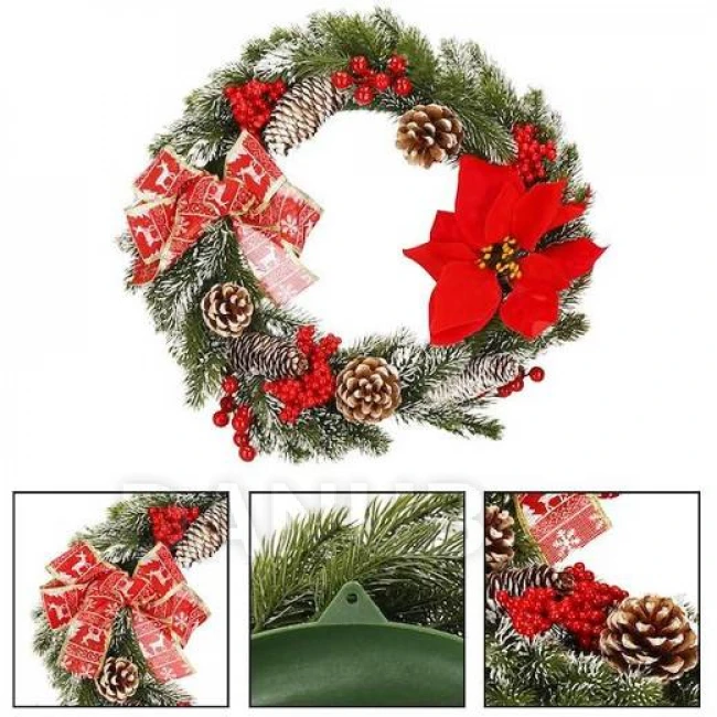 Vánoční věnec je jedním ze symbolů svátků. Pokud letos nemáte čas na vytvoření vlastního věnce, zvolte tento věnec. Námi nabízený věnec byl vyroben z borovicového jehličí přírodního vzhledu s efektem posypání sněhem. Kromě toho je bohatě zdoben různými dekoracemi: betlémská hvězda, koblihy, umělá jeřabina a mašle. Jeho vzhled si můžete upravit podle svých potřeb přidáním dalších vánočních ozdob, sušených pomerančů nebo dřevěných přívěsků. Vyplatí se ozdobit věnec vánočními světýlky, díky kterým bude výzdoba vypadat fenomenálně. Vánoční věnec musíte pověsit na přední dveře nebo komodu. Dá se použít i jako dekorace na stůl – stačí dát dovnitř svíčku.