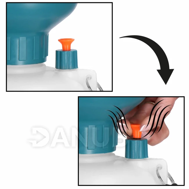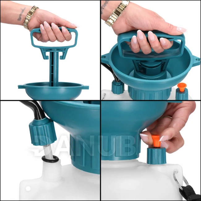 - Černý popruh je připevněn ke dvěma otvorům na obou stranách postřikovače