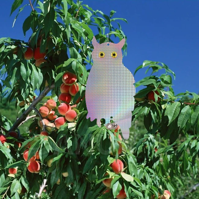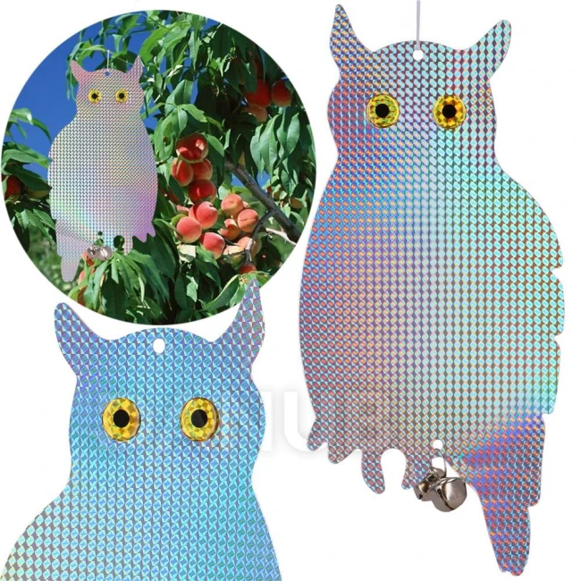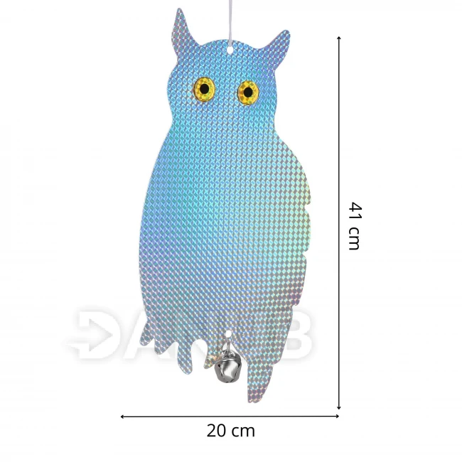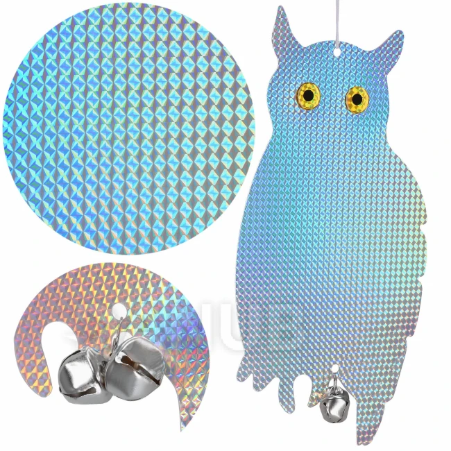 Závěsná holografická sedící sova - odpuzovač ptáků se zvonkem