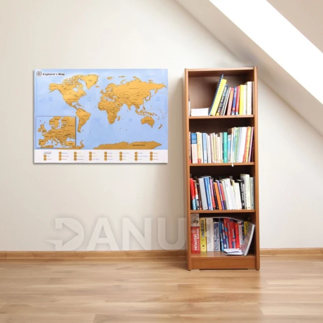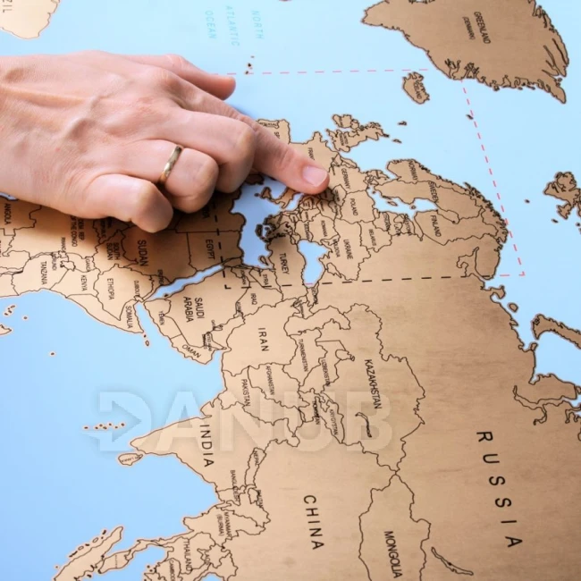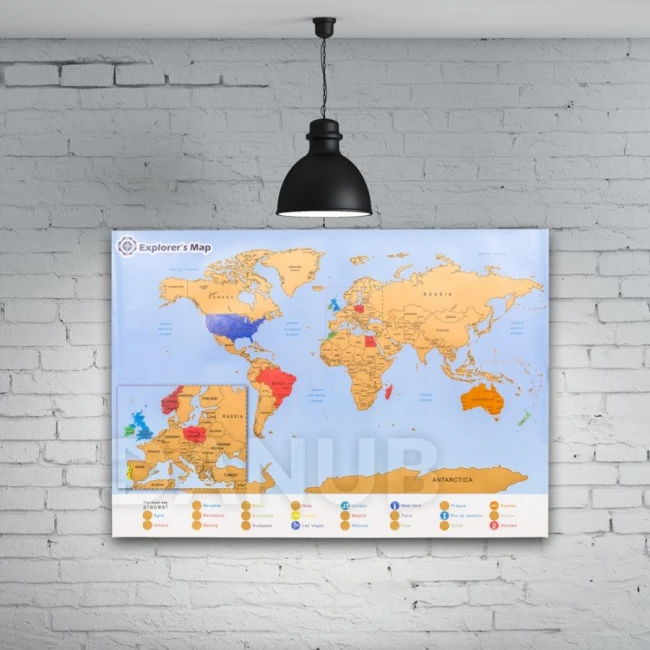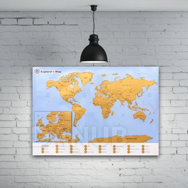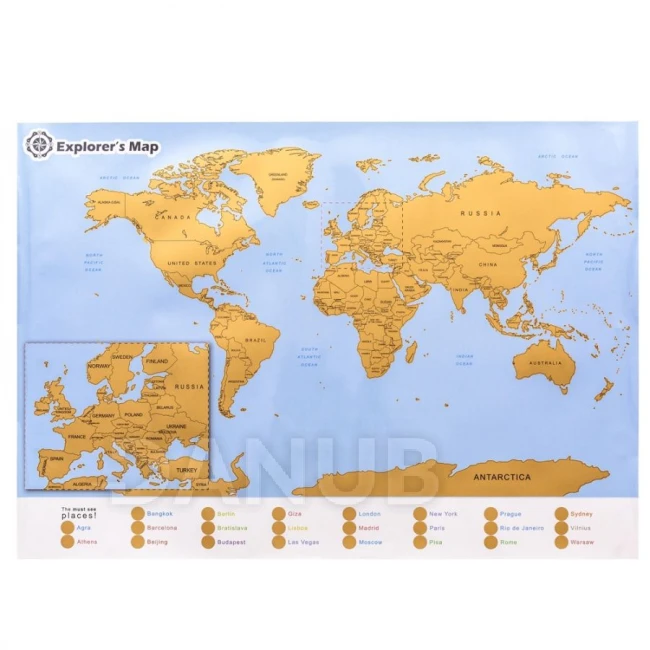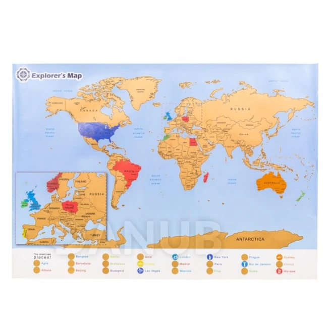 Stírací mapa světa s přiblížením na Evropu. Jednoduše stírejte navštívené místa.
