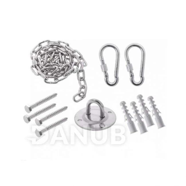 Sada kovových karabinek a háku na připevnění houpacích síti a houpaček. Vybavené odolnými a pevnými prvky které poskytují vysokou nosnost. Díky řetězu s karabinou můžete rychle a snadno natavovat výšku houpačky.