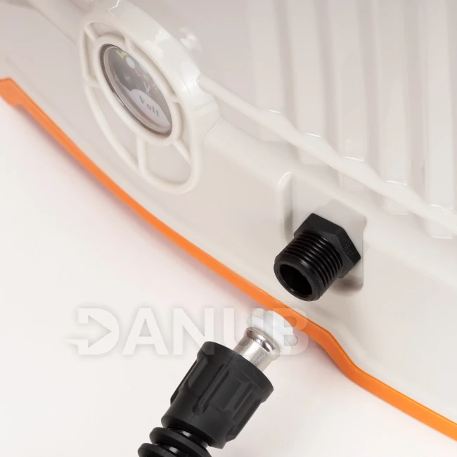 - Zámek: Rukojeť s oranžovým tlačítkem umožňuje uzamčení proudu pro nepřetržitý provoz.