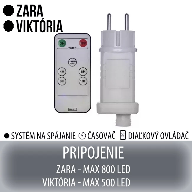 Napájecí adaptér s možností spojování Connecting system Vám umožní spojovat Vánoční osvětlení ze systému VIKTÓRIA (maximálně 500 Led), a spojovat vánoční osvětlení ze systému ZARA (maximálně 800 Led).
