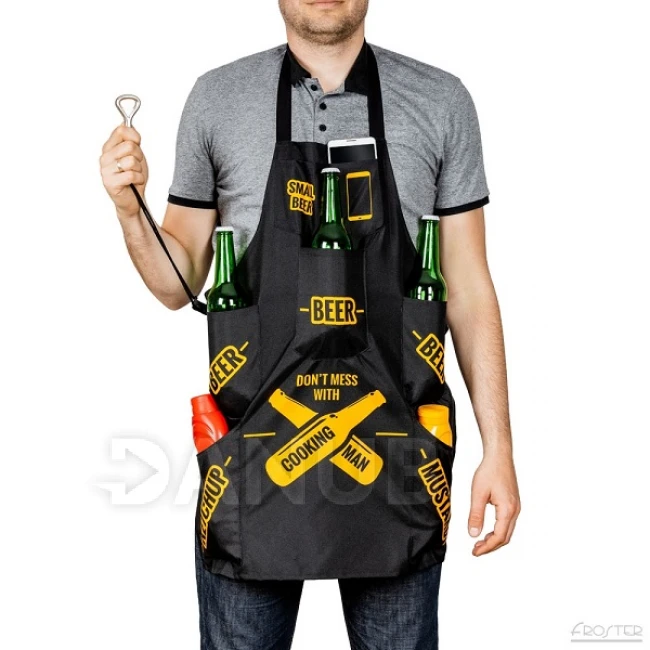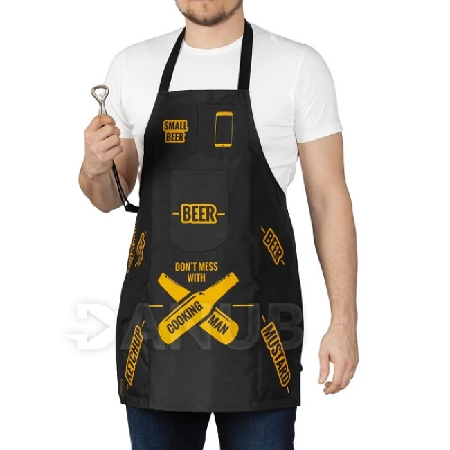 Mužská zástěra "Do not mess with cooking man" s kapsami a otvírákem na láhve.