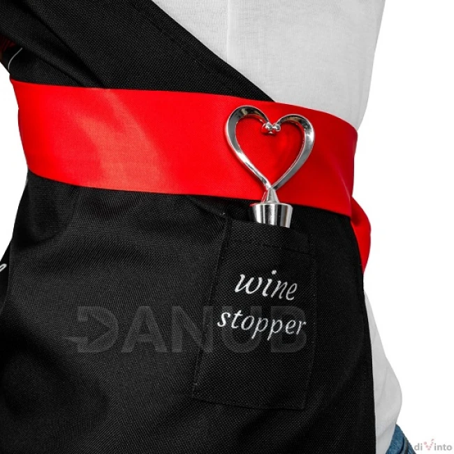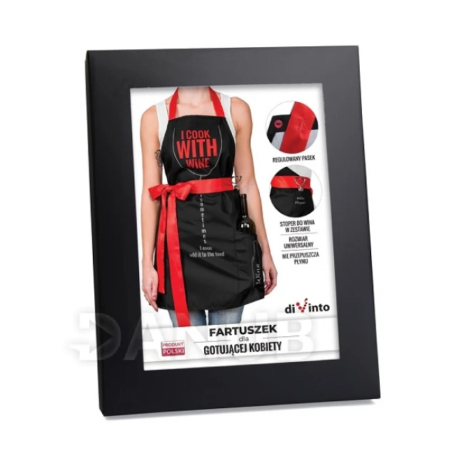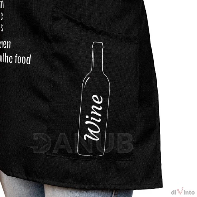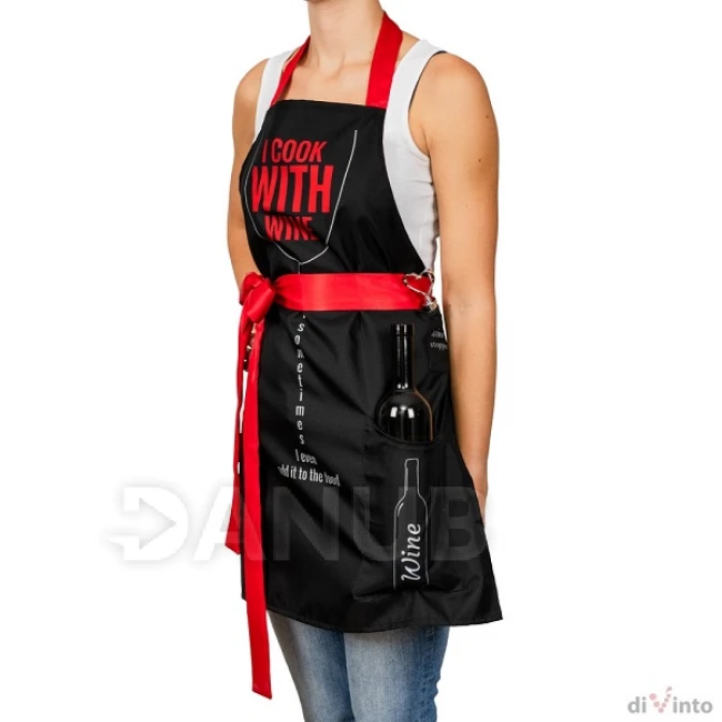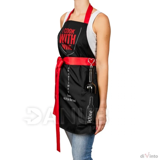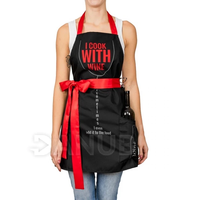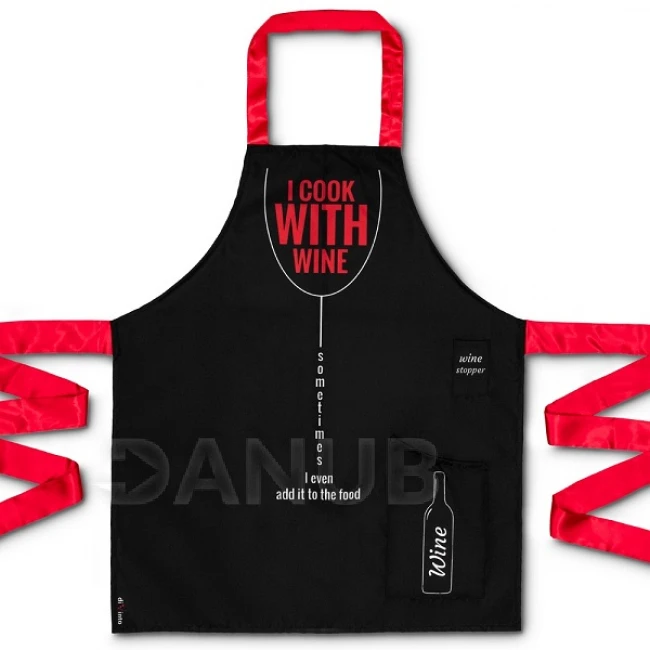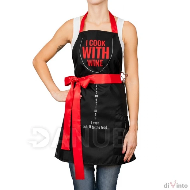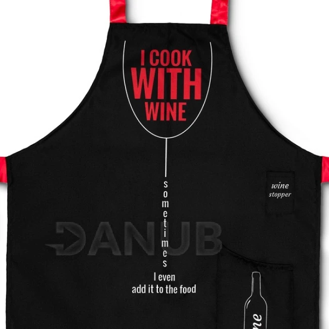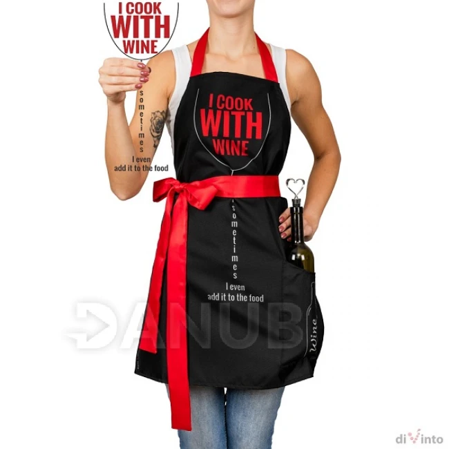 Vtipná žesnká zástěra s nápisem "I cook with wine. Sometimes I even add it to the food " s kapsami a zátkou na víno.